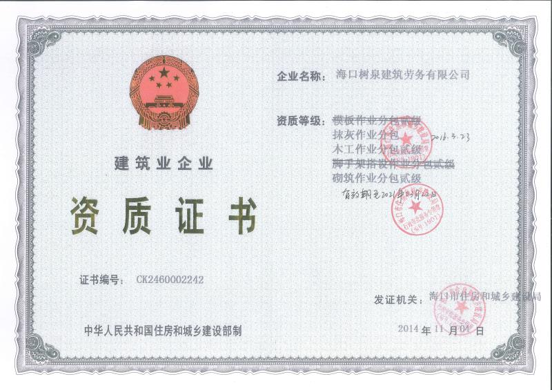 ??跇?shù)泉建筑勞務(wù)有限公司成立于2011年,公司位于??冢淝吧硎且患覍?zhuān)業(yè)建筑施工隊(duì),自2004年即開(kāi)始在海南從事建筑勞務(wù)施工。自成立至今,公司已經(jīng)擁有一支科學(xué)管理、質(zhì)量過(guò)硬、能打硬仗,搶工期的專(zhuān)業(yè)隊(duì)伍。能獨(dú)立承擔(dān)大中型工業(yè)與民用建筑 、室內(nèi)外裝修、各類(lèi)機(jī)電設(shè)備安裝工程。代表工程有海口濱海華庭、三亞時(shí)代海岸T01/02/04/05棟高層、合肥東海花園二期、陵水富力灣B區(qū)高層、三亞金中海(酒店)、瓊海大印經(jīng)典花園、海口環(huán)球海景大酒店(四星級(jí)酒店,在建中)、陵水珍珠大廈(五星酒店)、??谌f(wàn)達(dá)廣場(chǎng)、美蘭機(jī)場(chǎng)二期。